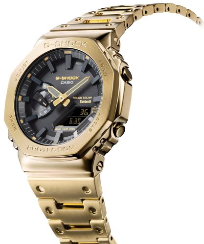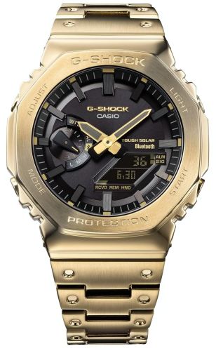 Мужские противоударные кварцевые наручные часы японского производства на солнечной батарее Casio GM-B2100GD-9A коллекции G-Shock с цифровой+стрелочной индикацией времени с модулем Bluetooth® Smart. Калибр механизма — 5691. Аккумулятор данной модели заряжается от любого источника света. Срок работы аккумулятора с полным зарядом — около 7-ми месяцев при обычном использовании без воздействия света после зарядки и 18 месяцев при хранении в полной темноте с включенной функцией энергосбережения после полной зарядки. Имеется режим энергосбережения (дисплей гаснет для экономии энергии, когда часы остаются в темноте). Примерный срок службы аккумулятора — не менее 10 лет. Корпус выполнен из нержавеющей стали. С помощью Bluetooth® вы можете подключить часы к смартфону и с помощью приложения CASIO WATCHES получить доступ к полезным функциям. Часы автоматически связываются с телефоном через Bluetooth® и проверяют точность времени 4 раза в сутки. Функция поиска телефона, можно включить тоновый сигнал на телефоне, что позволит быстро найти телефон. Настройка и управление таймером, секундомером и будильником. Запись текущего местоположения (TIME & PLACE). Можно проверить уровень заряда аккумулятора. Функциональность данной модели: формат времени 12/24, вечный календарь до 2099 года, возможность установки индикации дня недели на Русский язык, функция летнего времени (DST), мировое время 38 городов (38 часовых поясов), 5 независимых будильников, сигнал начала часа, секундомер с точностью 1/100 секунды и измерением до 59 минут 59 cек., таймер обратного отсчета (диапазон времени 60 минут) с шагом 1 сек., двойная диодная подсветка циферблата с возможностью выбора времени свечения (1.5 или 3 секунды), функция выключения звука кнопок (Mute), возможность отображения дня недели на нескольких языках, функция смещения стрелок для удобного просмотра информации на цифровом экране, функция поиска телефона (при нажатии кнопки на ваших часах смартфон подает звуковой сигнал). Стрелки и метки покрыты необритовым (Neobrite) люминесцентным напылением (светятся в темноте). Модуль часов снабжен элементами из материала alphaGEL, который еще лучше защищает часы от сотрясения и вибрации. AlphaGEL представляет собой гибкую силиконовую прослойку, оказывающую амортизирующий эффект. Завинчивающаяся задняя крышка часов. Литой стальной браслет. На корпус и браслет нанесено стойкое PVD покрытие. Водонепроницаемость WR200 (20 атм). Японская сборка (Made In Japan).